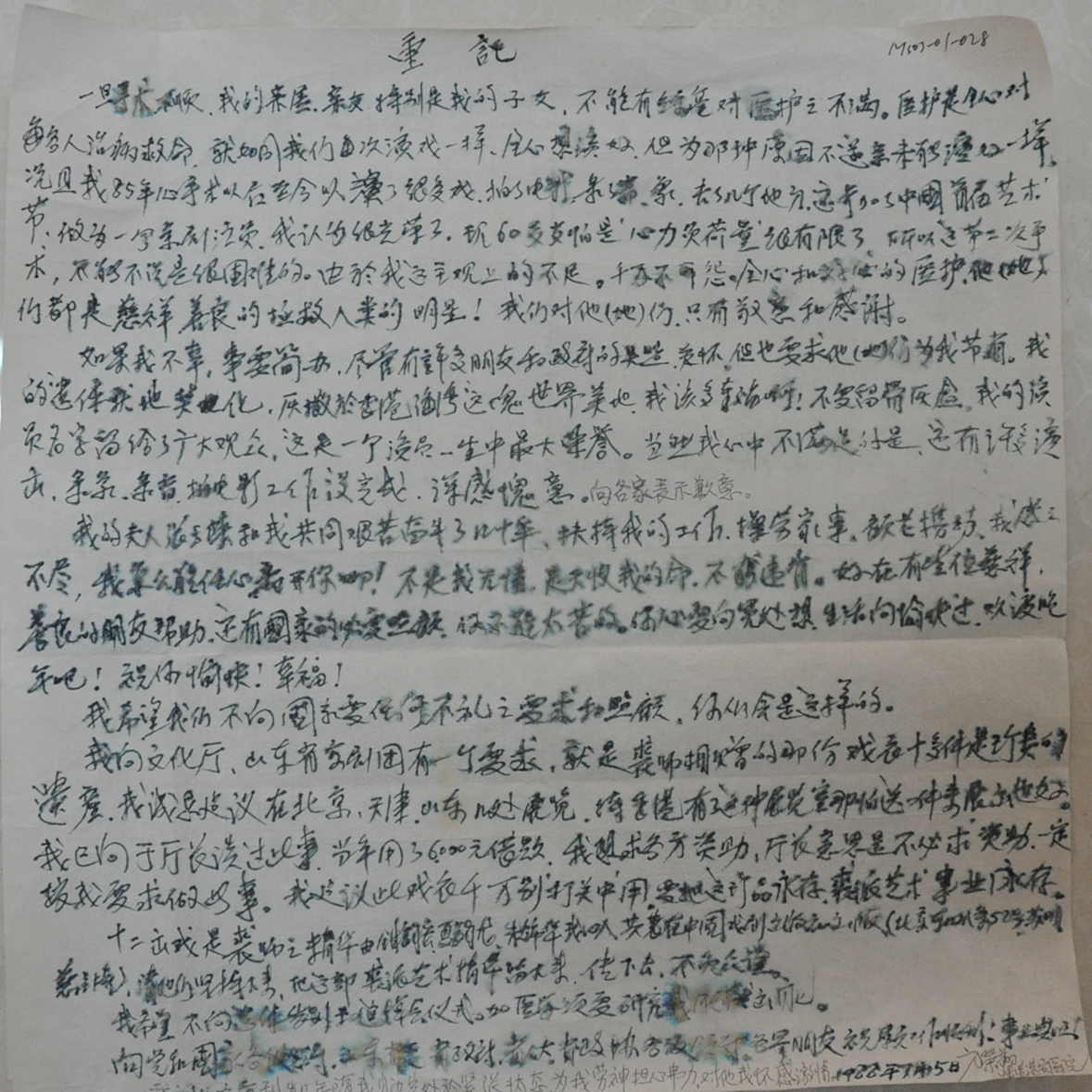 一旦手术不顺,我的亲属、亲友,特别是我的子女,不能有丝毫对医护之不满。医护是全心对每个人治病救命,就如同我们每次演戏一样,全心想演好,但为那种原因不遂意未能演戏一样。况且我85年手术以后至今已演了很多戏,拍了电影,录了音像,去了几个地方,还参加了中国首届艺术节,作为一名京剧演员,我认为很光荣了。现在60多岁,怕是心力负荷量很有限了,所以这第二次手术,不能不说是很困难的。由于我主观上的不足,千万不可怨全心和好心的医护,他(她)们都是慈祥、善良的拯救人类的明星!我们对他(她)们,只有敬意和感谢。