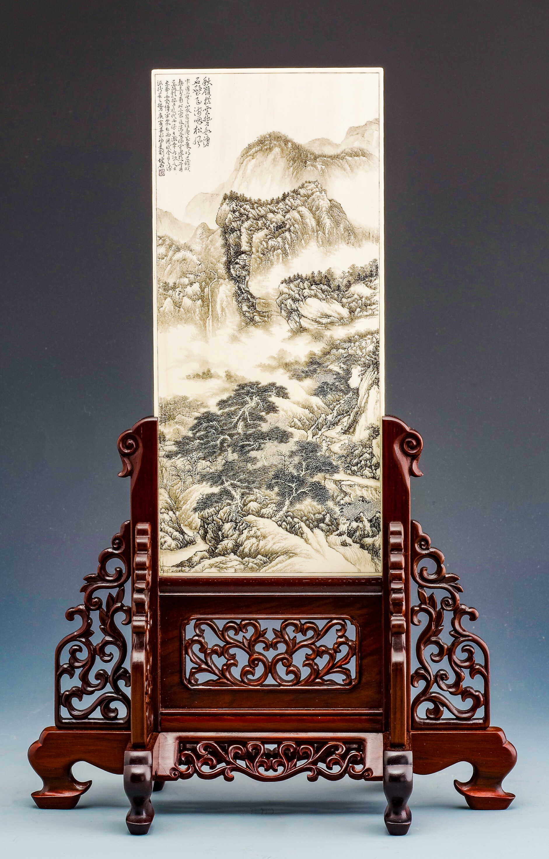 象牙浅刻又称象牙线刻、平刻,简称牙刻,是传统象牙雕刻工艺的重要组成部分,又是一种与书画艺术相结合的文人雕刻。它以金属平刀、钩刀为工具,在象牙器具表面作豪米深浅的阴线刻画与刮琢,再用毛笔掭水墨、颜料对凹处进行填染而形成画面。