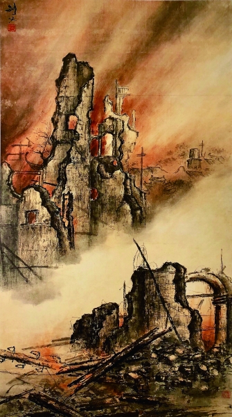 《东战场的烈焰》前景描绘了图书馆在遭到轰炸后的断壁残垣,右侧的拱门似乎是在用以暗示废墟的前身。高剑父以类似于篆书的笔触勾勒出断壁的轮廓,再施以渲染和皴擦,融合了中国传统绘画和日本绘画的技法特征,表现了战争废墟现场的萧索和悲剧色彩。