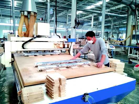 松源木业生产车间内,来自境外的木材正在被加工成供宜家销售的家具。