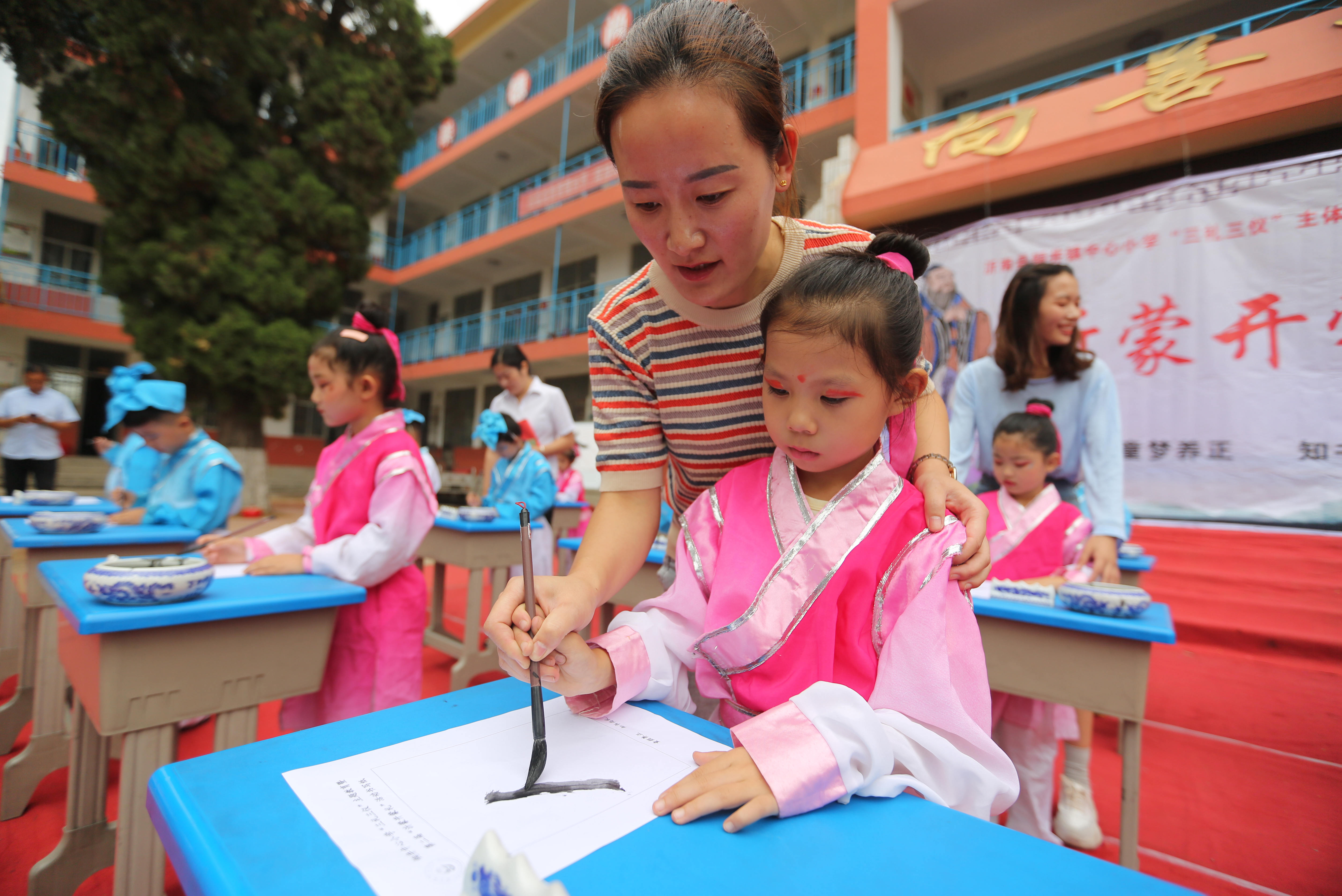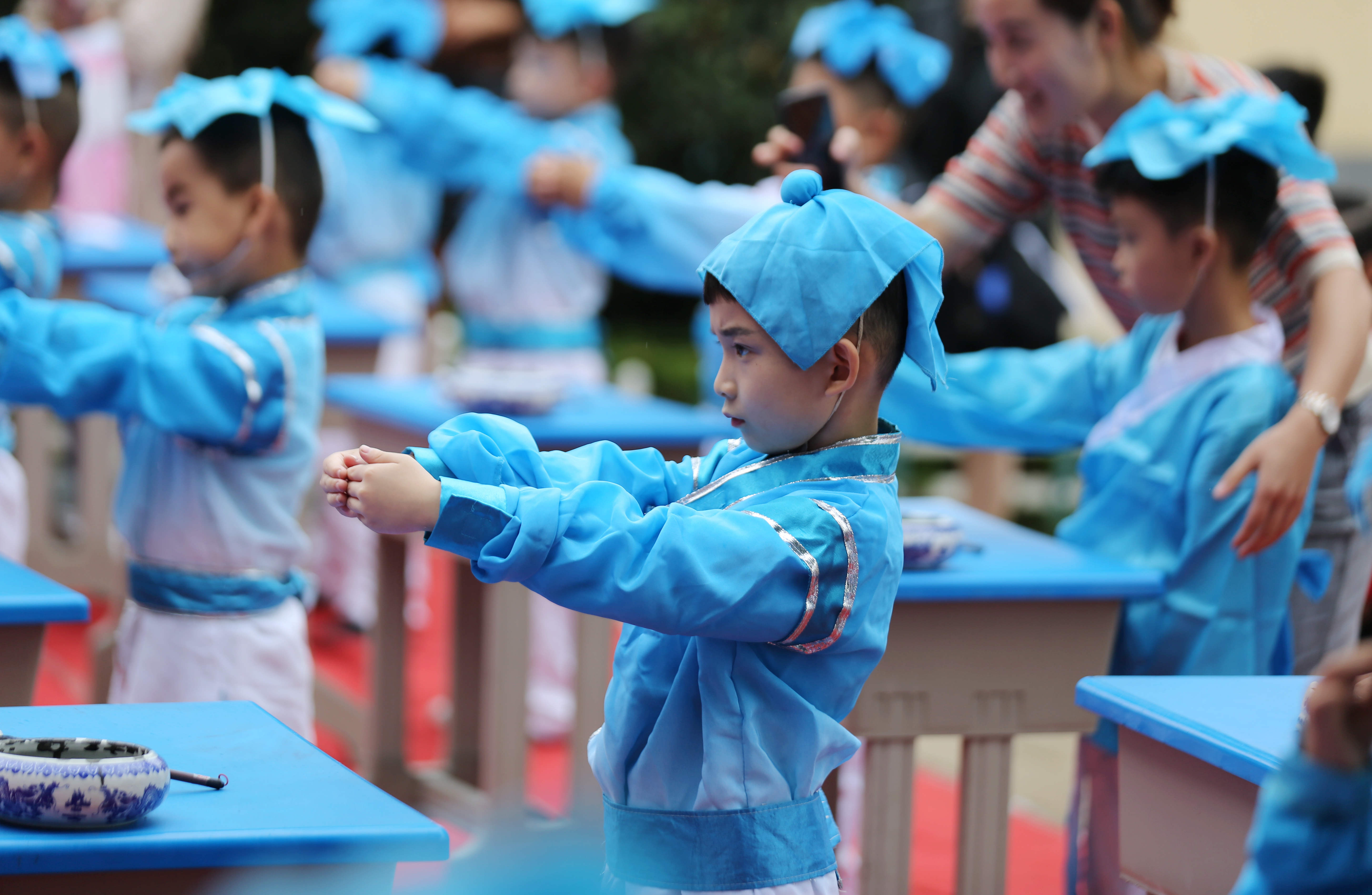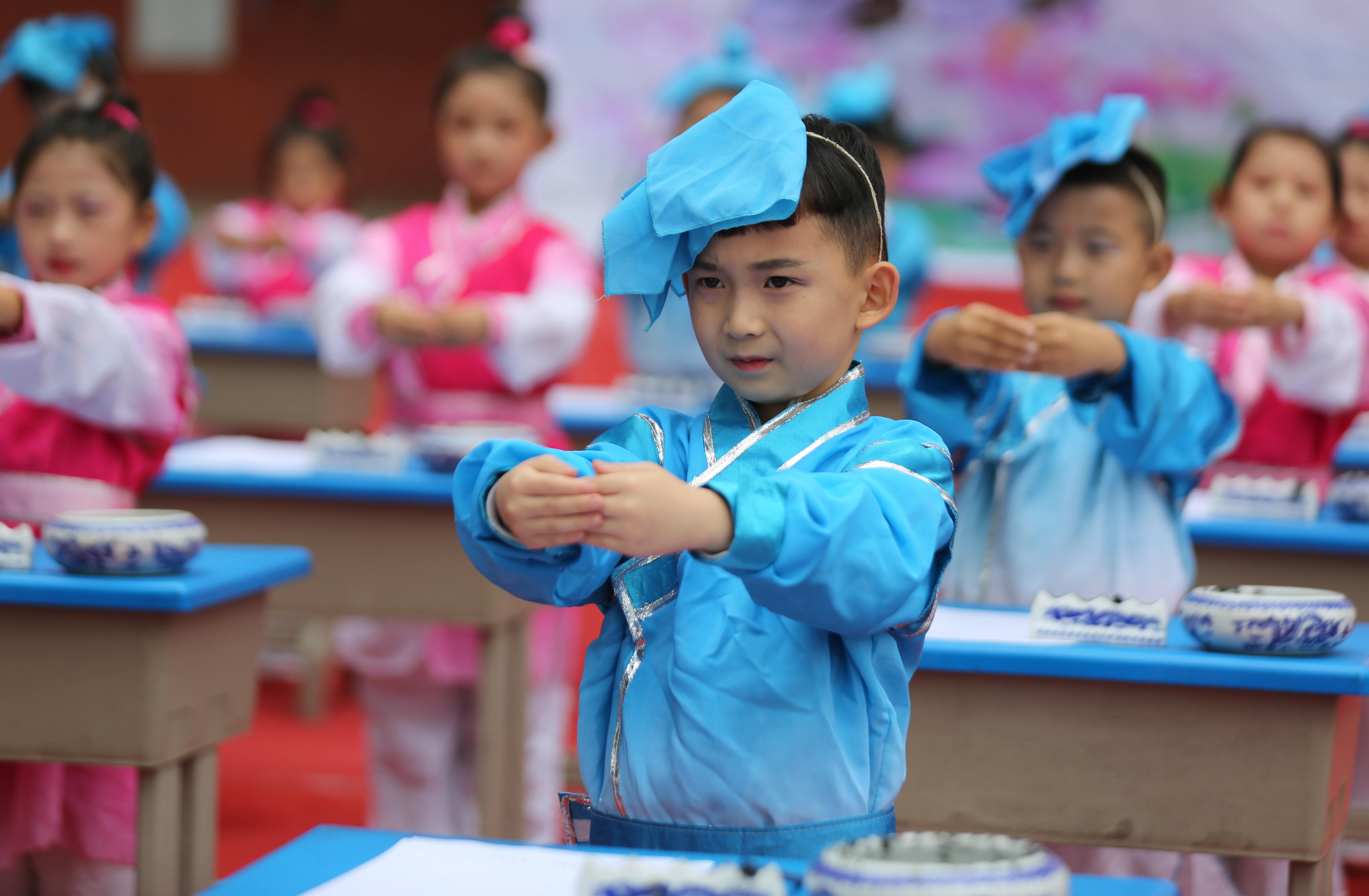 9月12日,山东省临沂市沂南县铜井镇中心小学举行新生开蒙礼仪式,孩子们身着汉服,头戴纶巾,通过互正衣冠、朱砂启智、击鼓明智、朗诵《弟子规》等活动,感受中华民族传统文化,开启人生“第一课”。 9月12日,山东省临沂市沂南县铜井镇中心小学的老师在“开蒙礼”上为一年级新生点朱砂(王彦冰 马峰摄)
