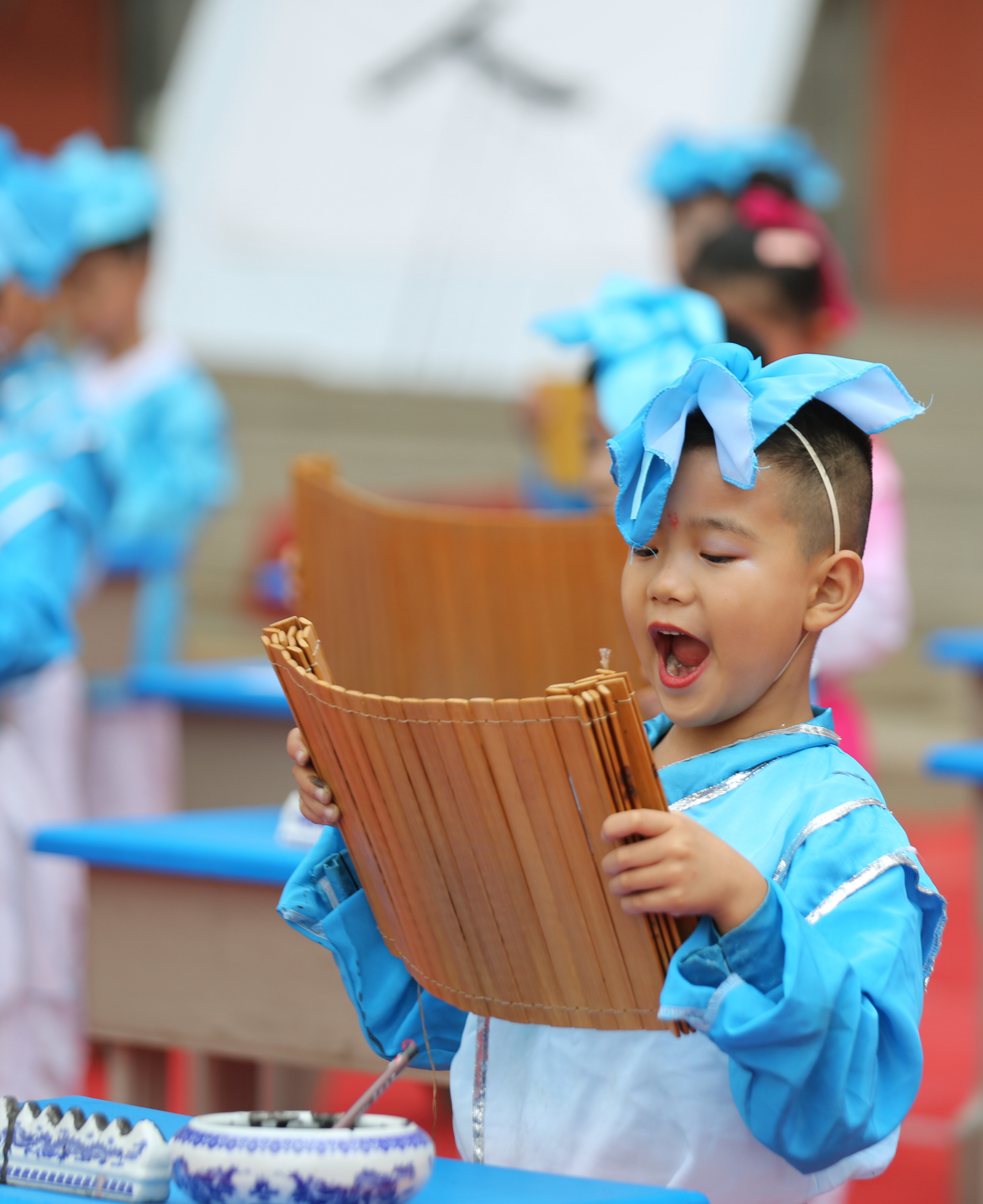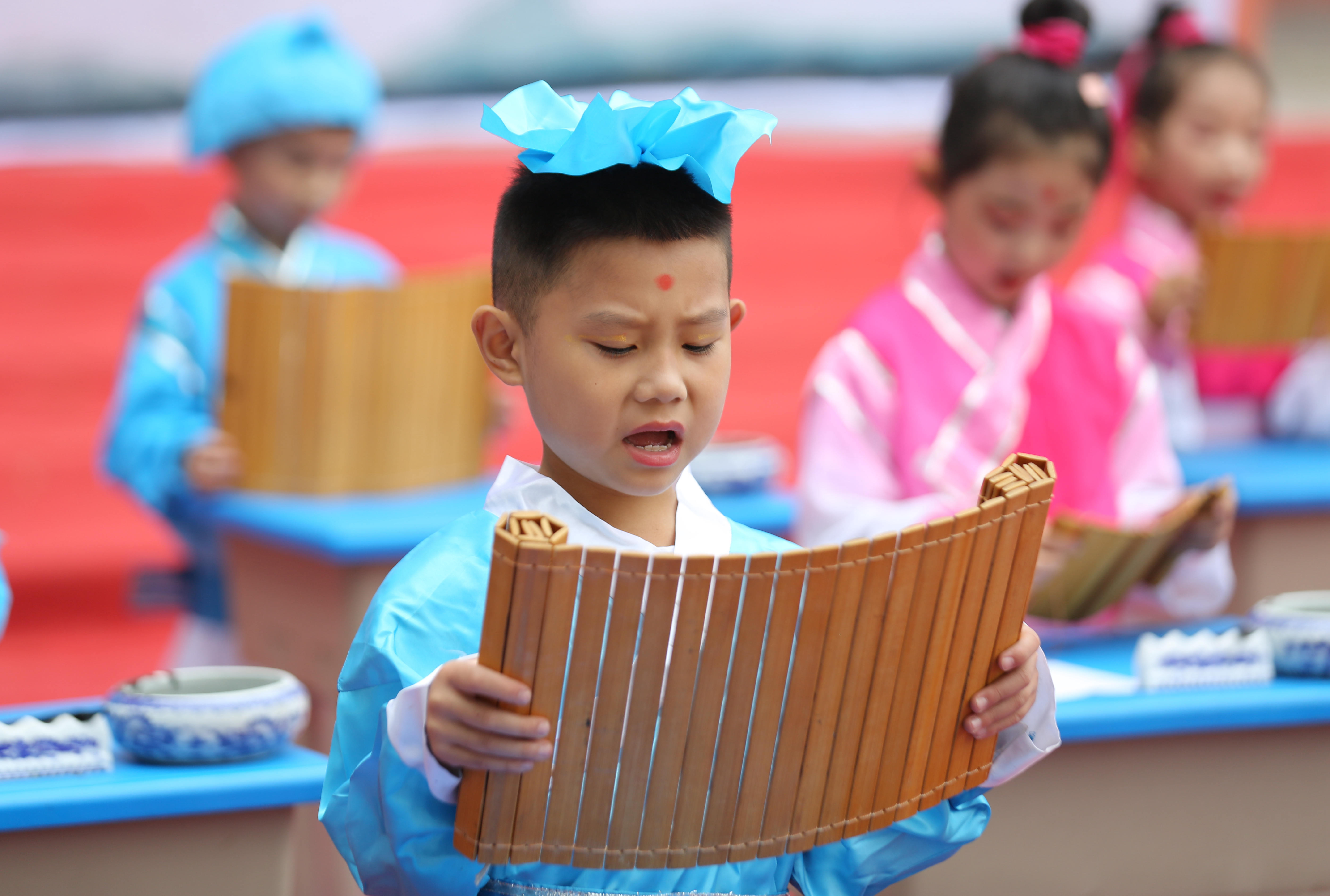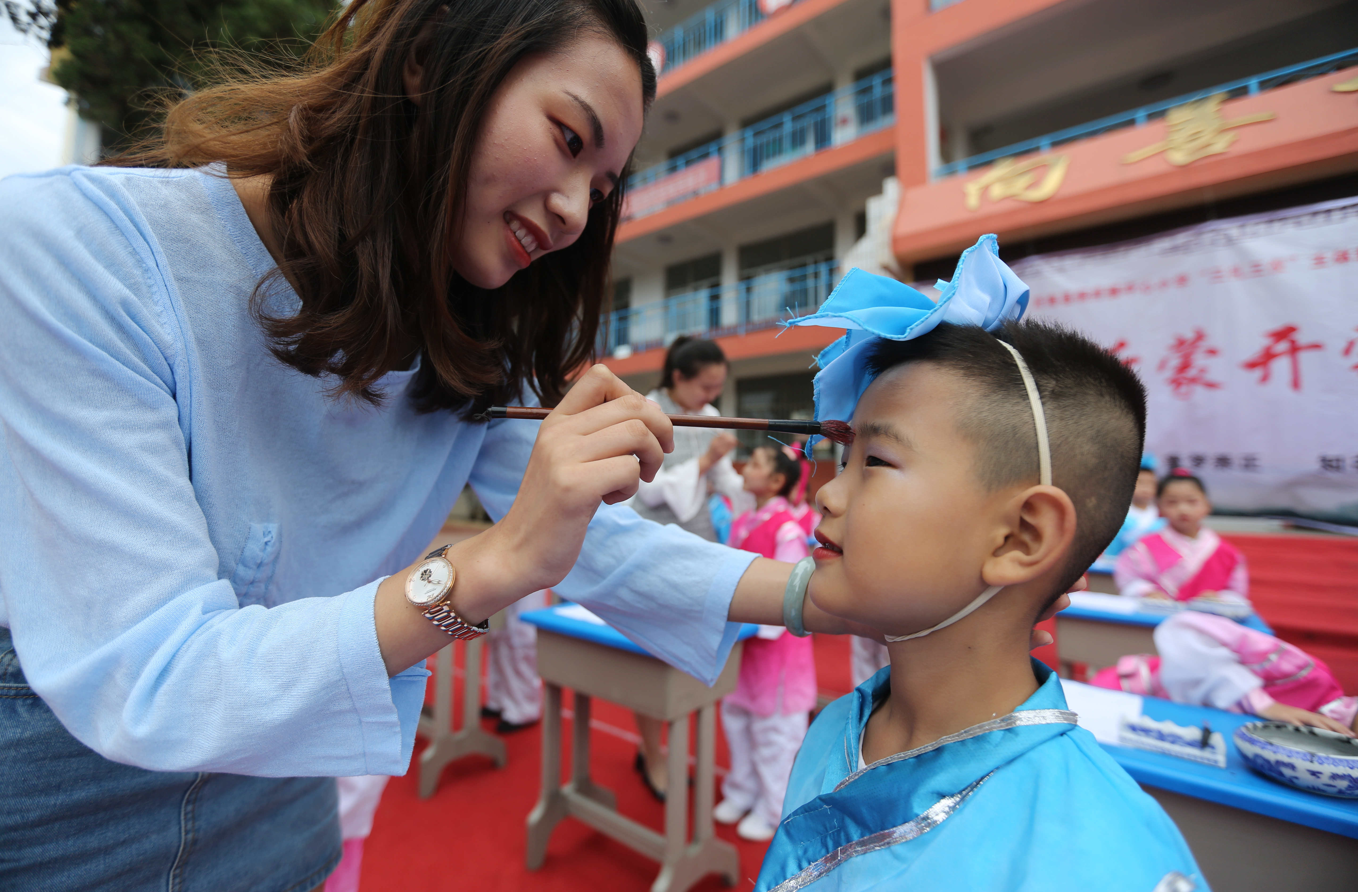 9月12日,山东省临沂市沂南县铜井镇中心小学举行新生开蒙礼仪式,孩子们身着汉服,头戴纶巾,通过互正衣冠、朱砂启智、击鼓明智、朗诵《弟子规》等活动,感受中华民族传统文化,开启人生“第一课”。 9月12日,山东省临沂市沂南县铜井镇中心小学的老师在“开蒙礼”上为一年级新生点朱砂(王彦冰 马峰摄)