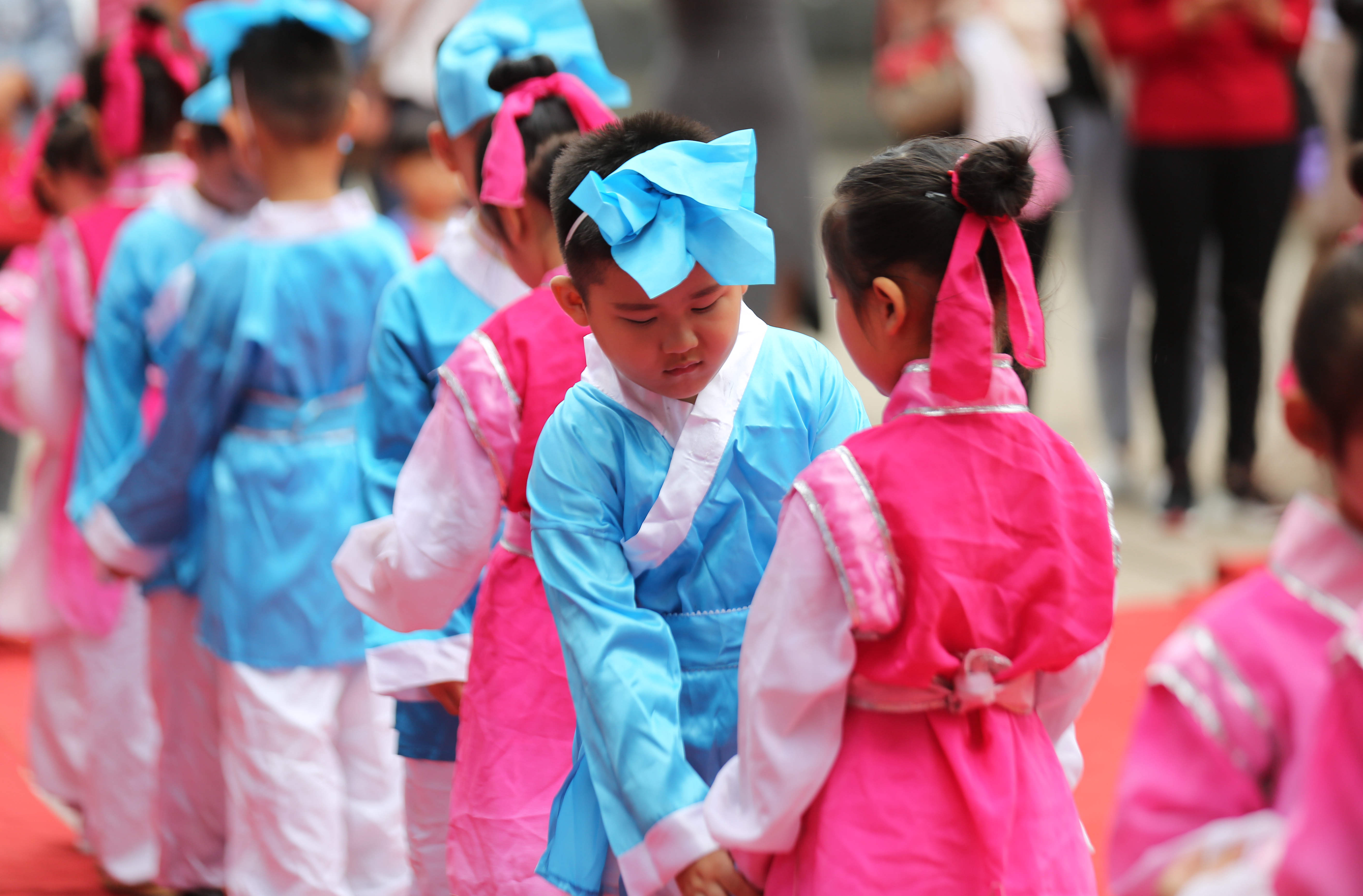 9月12日,山东省临沂市沂南县铜井镇中心小学一年级新生在“开蒙礼”上行拜师礼(王彦冰 马峰摄)