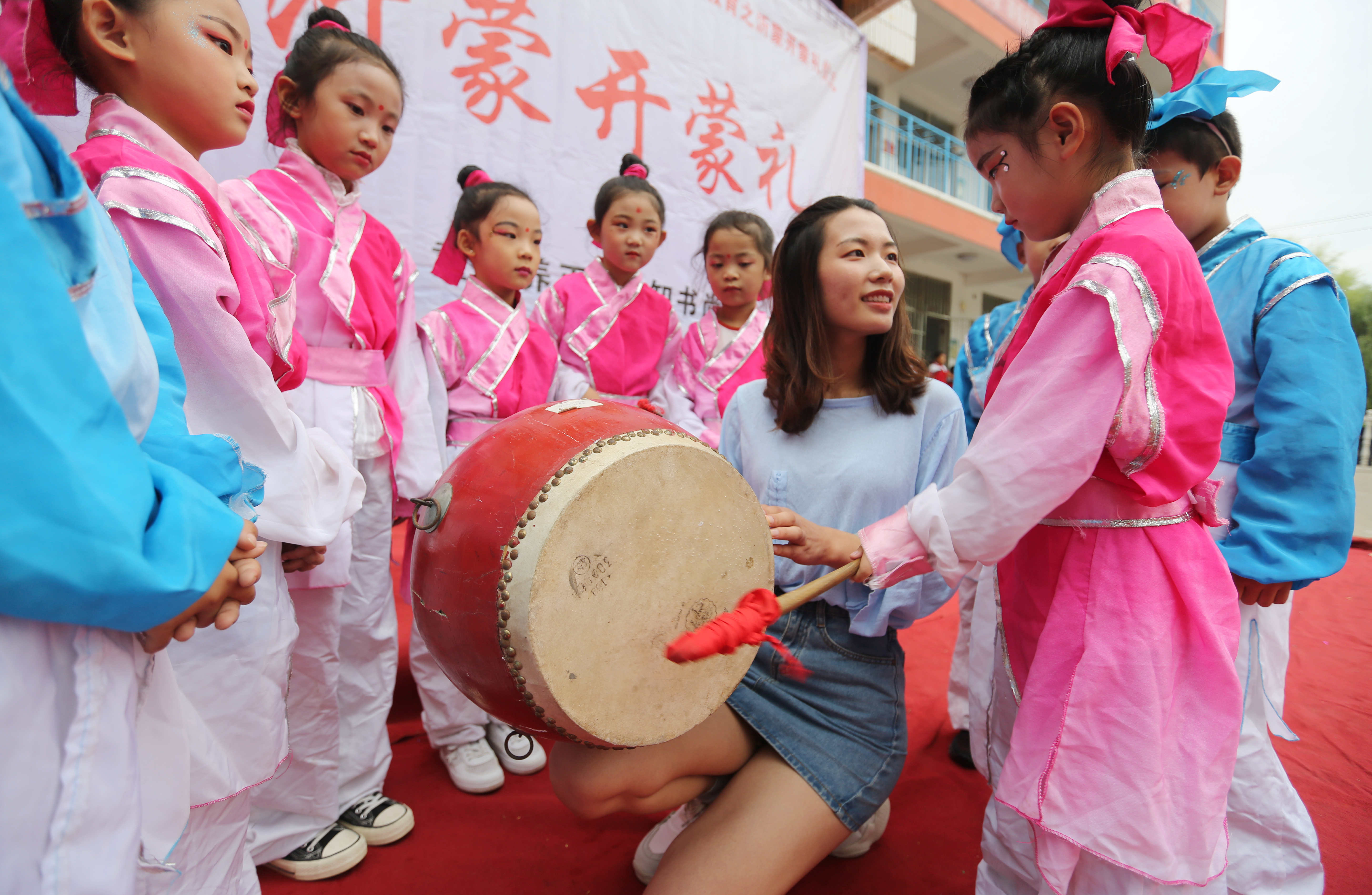 9月12日,山东省临沂市沂南县铜井镇中心小学一年级新生在“开蒙礼”上进行击鼓明智(王彦冰 马峰摄)