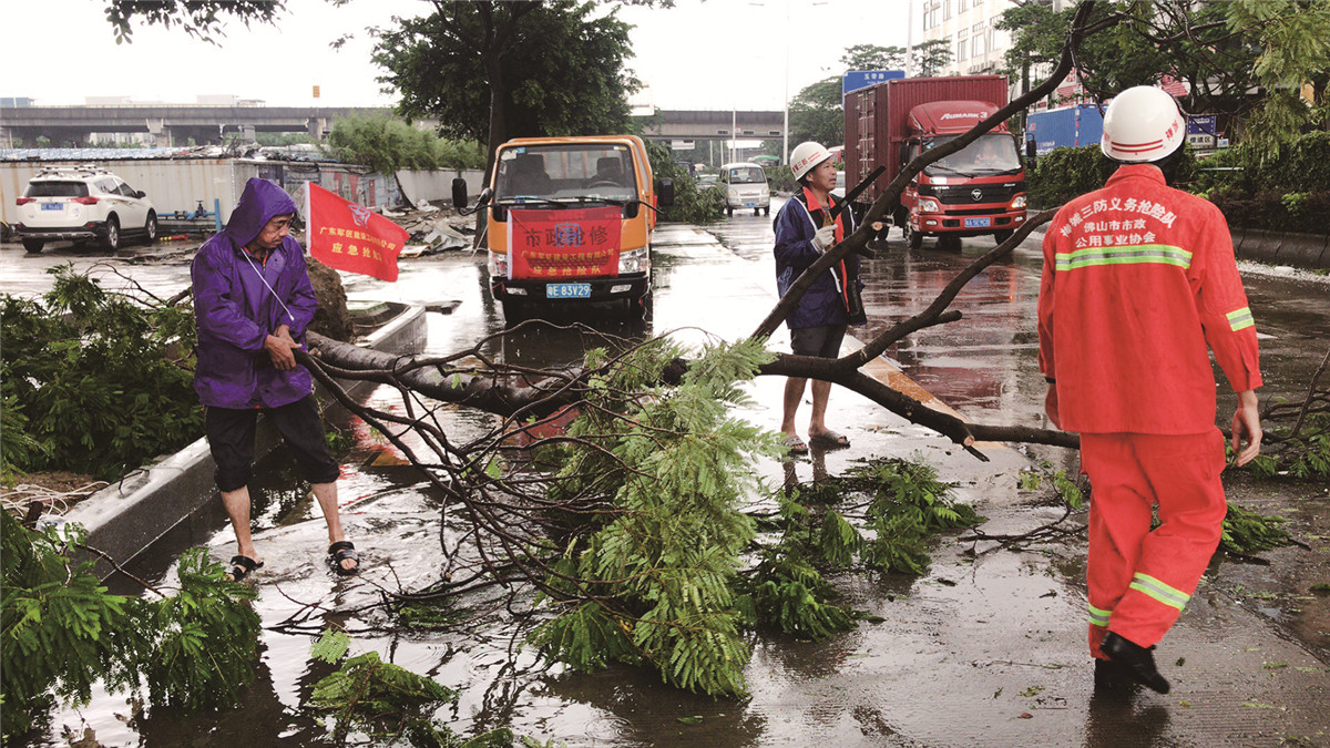 台风“山竹”是禅城区三防义务抢险队迎来的第一次大考。2018年9月17日中午,在岭南大道上,禅城区三防义务抢险队第四分队负责清理倒伏的树木,他们娴熟地用电锯先将倒伏树木的树枝锯断,再将树枝有序堆放在一边,等待工程车辆将其运走。等全部清理完毕后,队员们就在路边蹲着吃盒饭解决午餐。