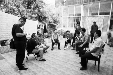 在长直乡峪里村五星级文明户弟小民(左三)的院子里采访垣曲县“星级文明户”创评工作。马建军 摄